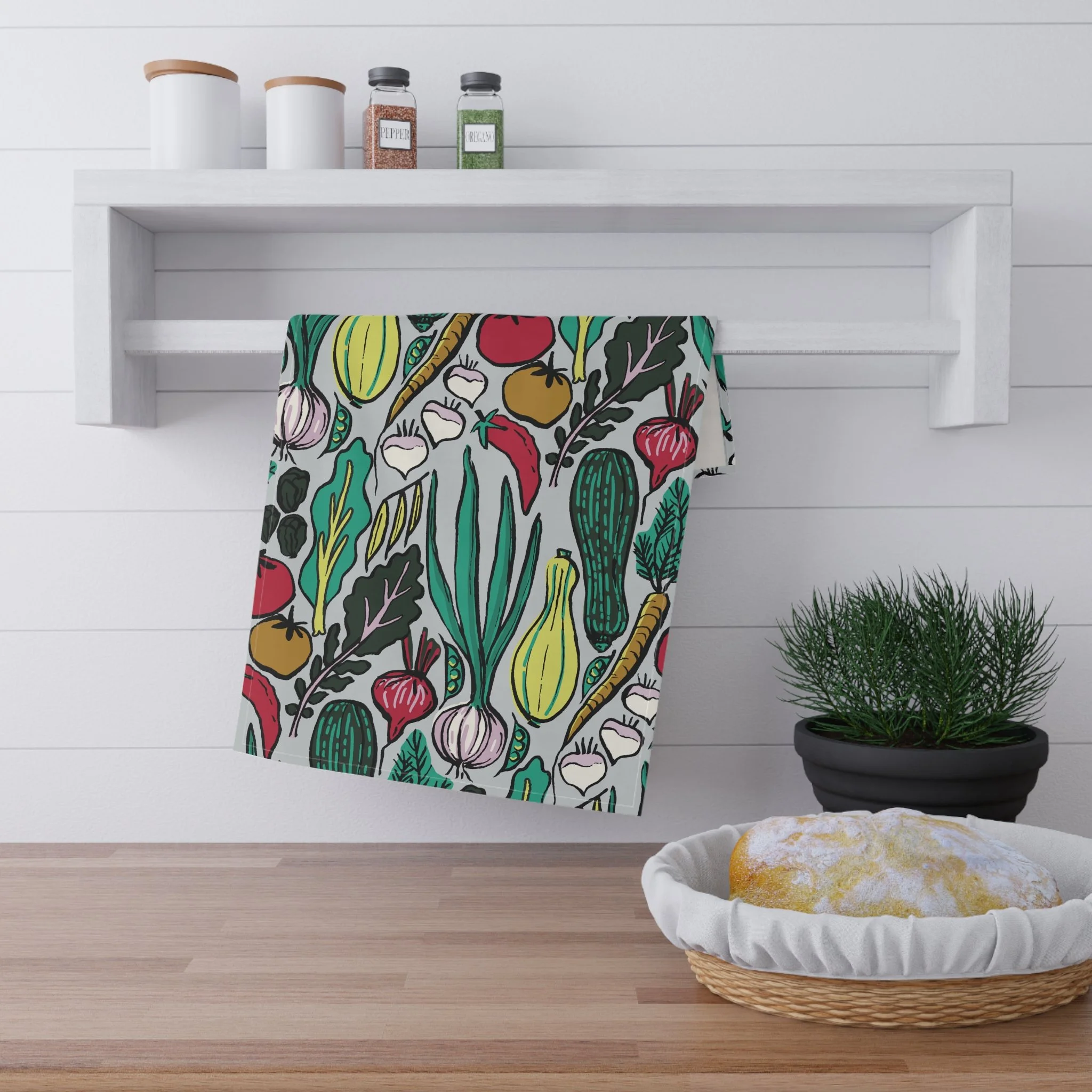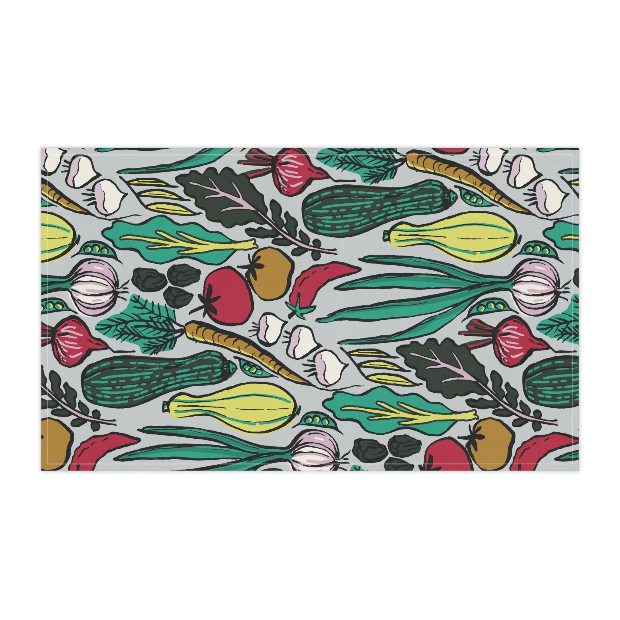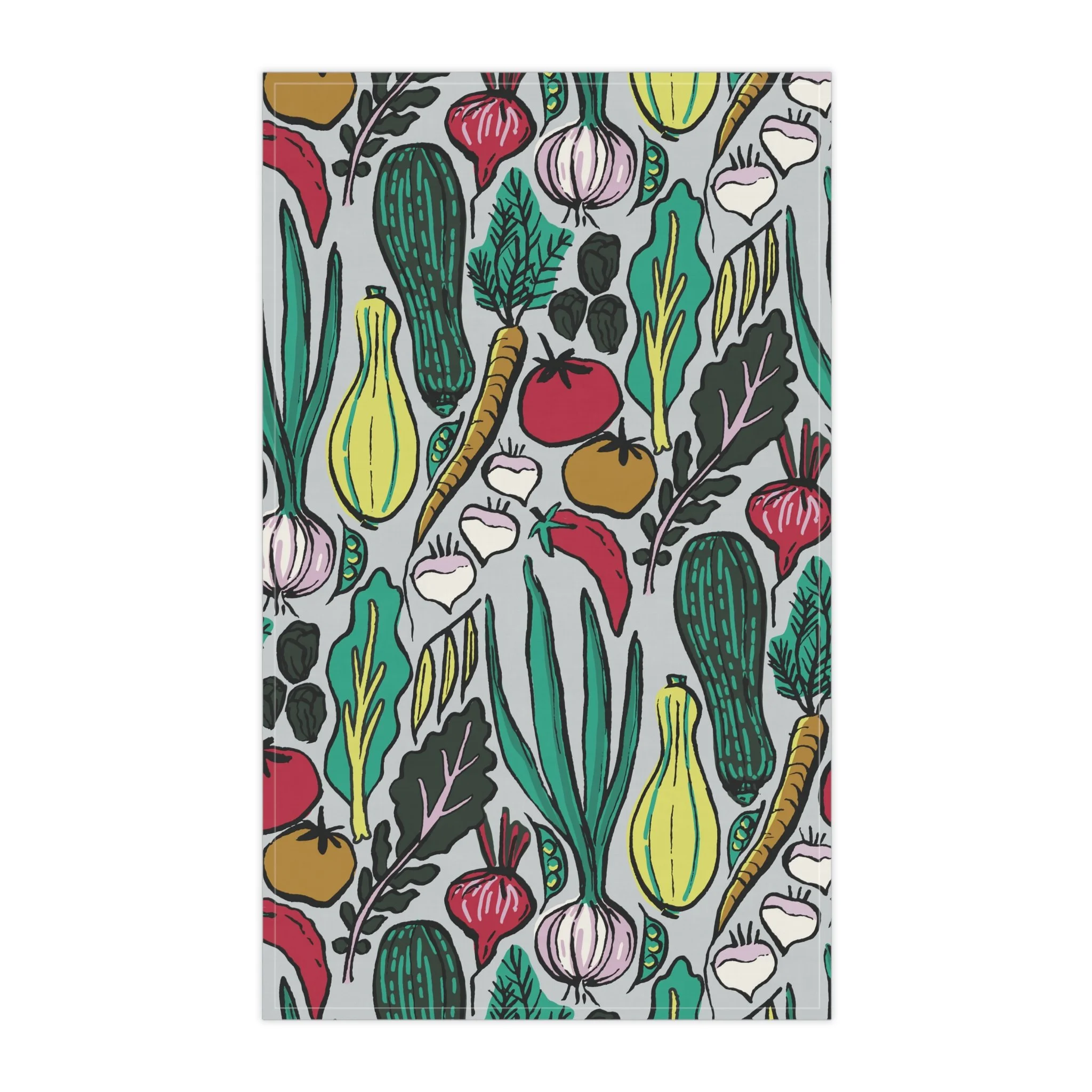 All I Grew in My Garden: Garden tomatoes, zucchini, summer squash, beets, carrots, red onions, and chili peppers spill across the fabric like a small, joyful harvest. You can drape it over an oven handle, use it to pat pastry dough, or fold it beside a cutting board while chopping the very vegetables it celebrates.