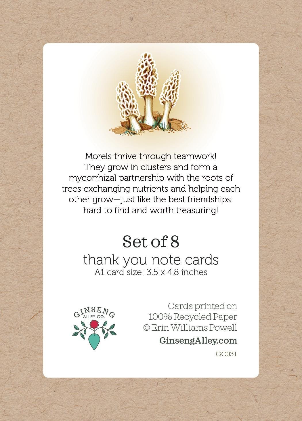 On the back of the card there's a bit of Morel Mushroom Trivia: "Morels thrive through teamwork! They grow in clusters and form a mycorrhizal partnership with the roots of trees exchanging nutrients and helping each other grow—just like the best friendships: hard to find and worth treasuring!"